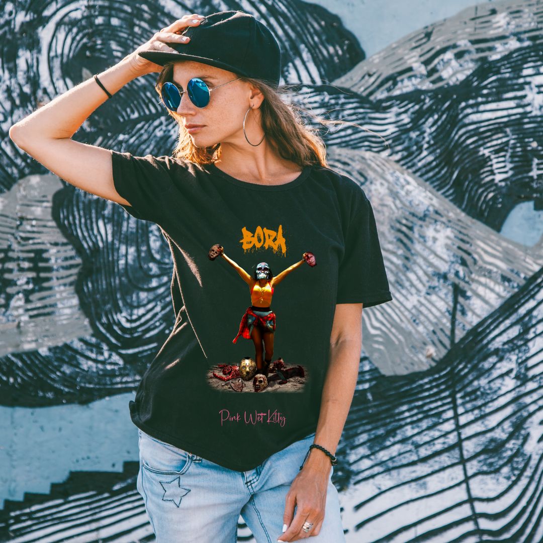 Embrace the thrill and danger with the newest queen of horror. Get your hands on the exclusive BORA T-shirt from the "Deadly Kitty Series" collab with Pink Wet Kitty. Available in black for ultimate comfort. Don't wait, order yours now before they're gone!
